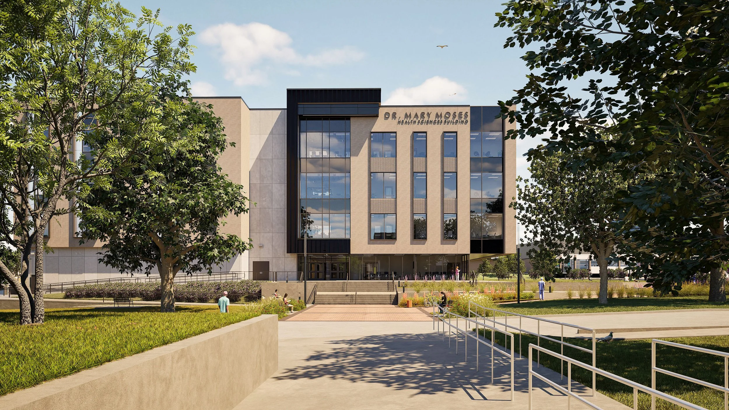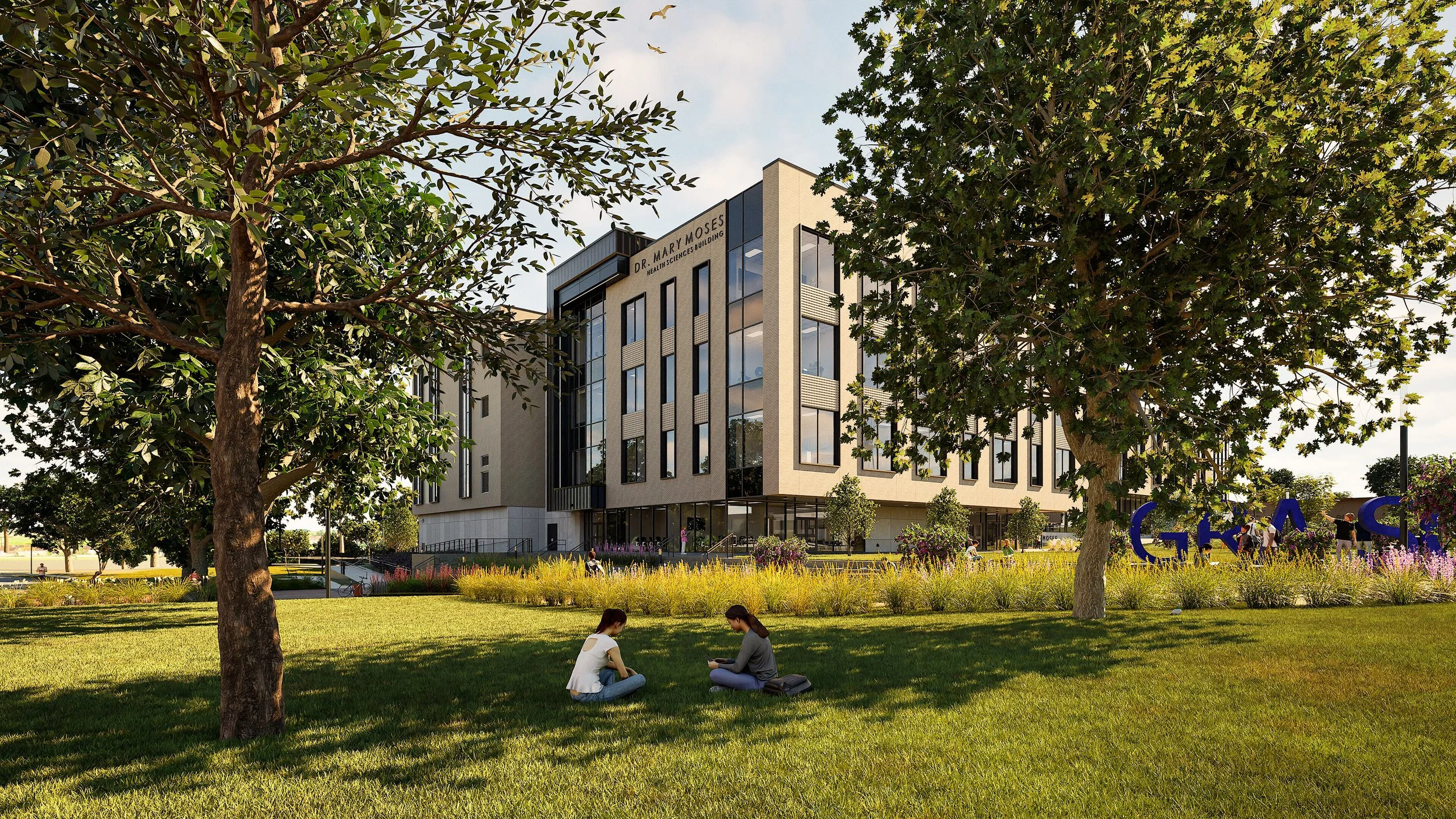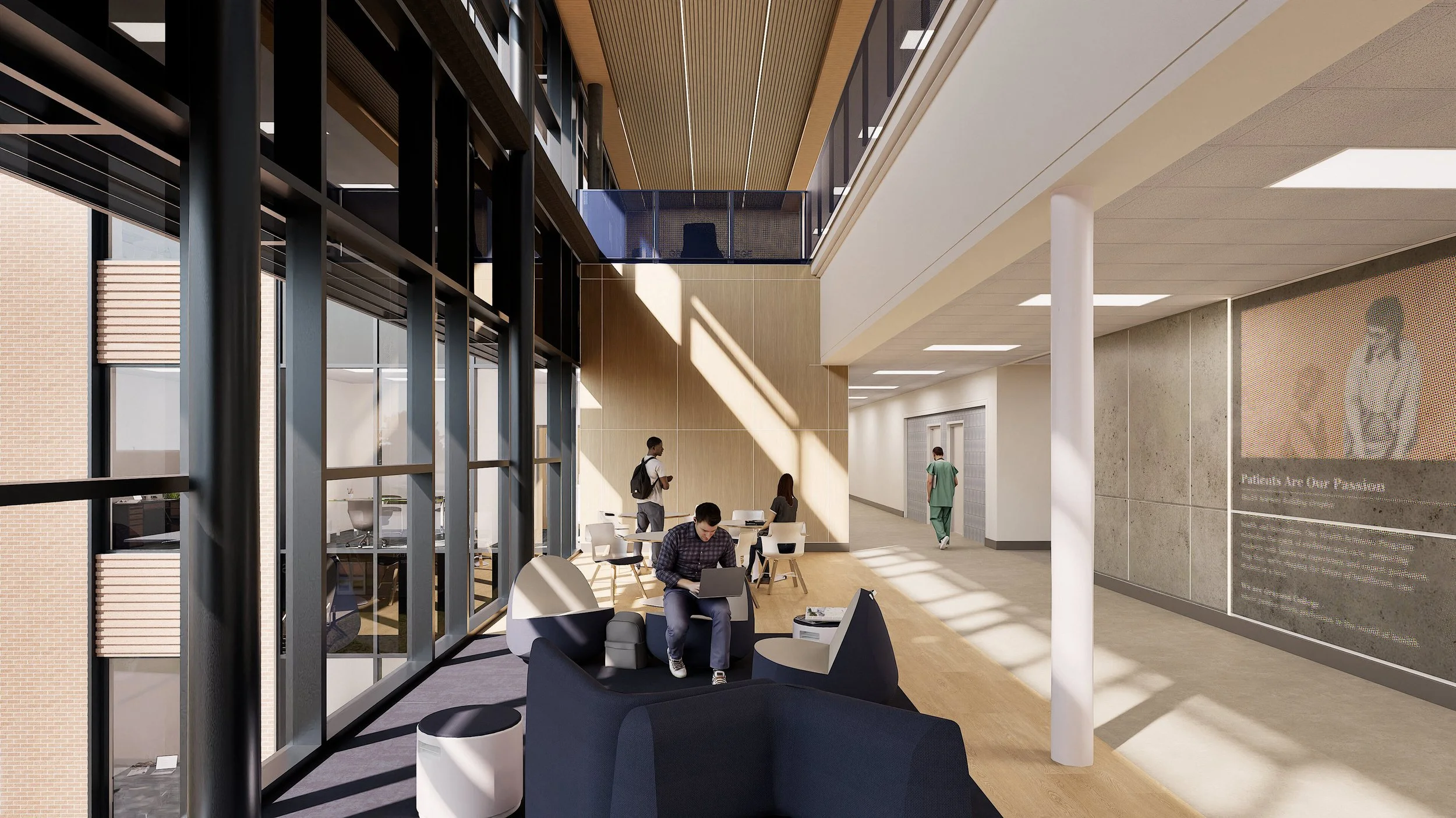The new Dr. Mary Moses Health Sciences Center will serve as the campus's central hub, linking existing buildings with future projects. This 4-story building is organized for both public and private use. The first level connects with the campus community, featuring a large lecture hall, student lounge, IT services, and flexible multipurpose spaces that open to a new plaza. The additional three levels focus on the core health sciences program, centered around three quads—Skills/Simulative Learning, Instructional Learning, and Faculty Suites—connected by a grand atrium. The second level will showcase healthcare education with a 24,000 sq. ft. simulated hospital space. Each floor incorporates collaboration areas designed to enhance campus culture and student engagement.