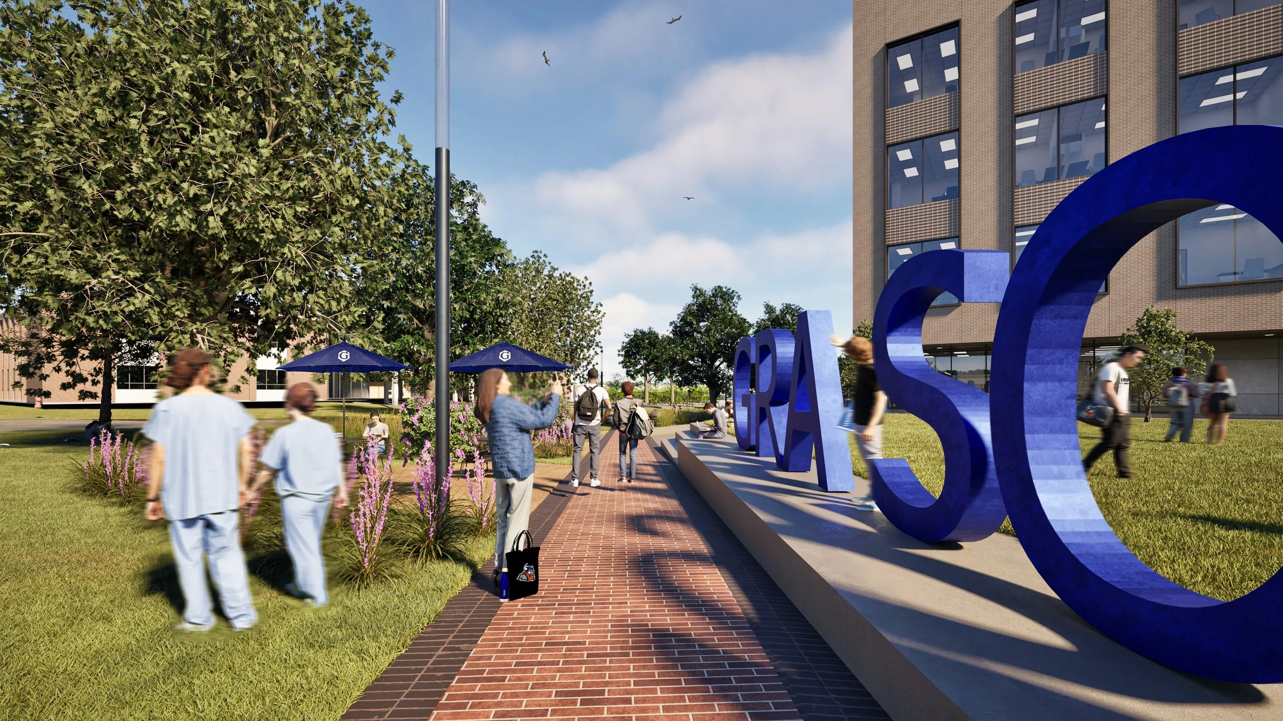 The new Dr. Mary Moses Health Sciences Center will serve as the campus's central hub, linking existing buildings with future projects. This 4-story building is organized for both public and private use. The first level connects with the campus community, featuring a large lecture hall, student lounge, IT services, and flexible multipurpose spaces that open to a new plaza. The additional three levels focus on the core health sciences program, centered around three quads—Skills/Simulative Learning, Instructional Learning, and Faculty Suites—connected by a grand atrium. The second level will showcase healthcare education with a 24,000 sq. ft. simulated hospital space. Each floor incorporates collaboration areas designed to enhance campus culture and student engagement.